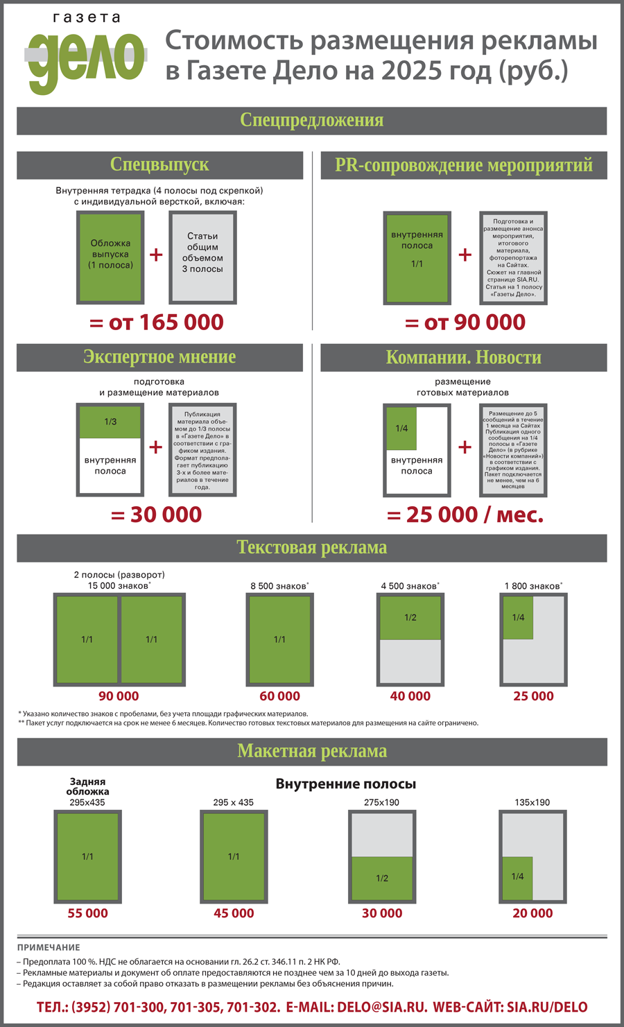 - Публикация материала объемом до 1/3 полосы в «Газете Дело» в соответствии с графиком издания. Формат предполагает публикацию 3-х и более материалов в течение года. |